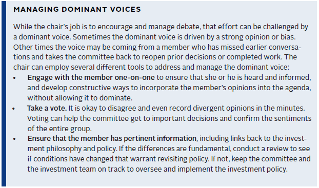 Effective chairs are not necessarily those with the most investment expertise. They understand institutional investing, but they also bring management skills to the position. Good chairs are good people managers. They are caring, direct, and take time to get to know their membership, so that each member can contribute his or her talents to the process. Successful leadership yields collegiality, respect, engaged members, informed decisions, and regular attendance.
