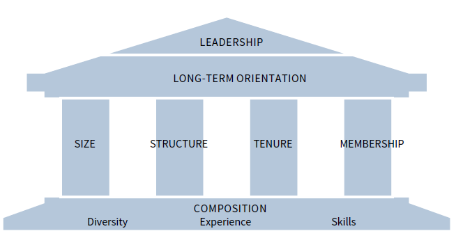 There is an art and a science to building an effective investment committee. The most effective investment committees comprise members with complementary skills and perspectives, an understanding of the long-term nature of an institutional portfolio, and an affinity for the organization. Different perspectives and institutional investment experiences are important. A long-term view that is aligned with the perpetual portfolio is essential. This long-term orientation unifies the committee members and governs their work. The committee’s work should be supported by membership, structure, size, and tenures that foster information flow, new ideas, and long-range stability (Figure 1).