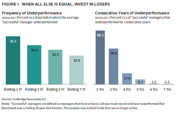 Only deploying capital into clear winners and/or avoiding underperformers entirely is likely a recipe for failure, given investment performance cycles. Similar to business acquisitions, the best time to buy a fundamentally sound enterprise is when temporary underperformance or market dynamics have driven its price down. Short-term underperformance can represent a window of opportunity for the wise investor who works to identify true long-term outperformers.