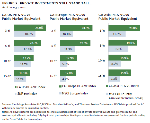 For investors of scale who have a long-term perspective and are willing to take on a measure of illiquidity, private investing (PI)—including private equity and venture capital (PE/VC)—can offer compelling long-term performance. As illustrated in Figure 2, PI has historically generated significantly higher returns than public equities.
