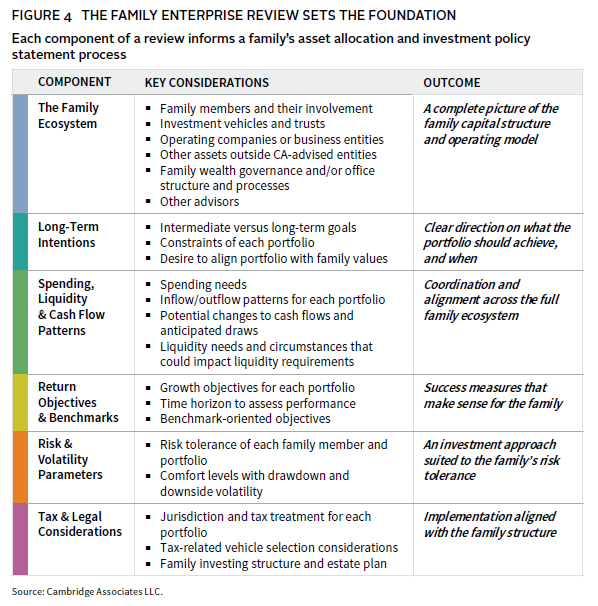 Establishing goals at the outset is essential to building, maintaining, and enhancing a large, diversified investment portfolio over time. The process should begin with a family enterprise review, which identifies the factors that shape each unique family wealth plan. As illustrated in Figure 4, these dimensions include a picture of the family capital structure, long-term goals, return objectives, and much more.