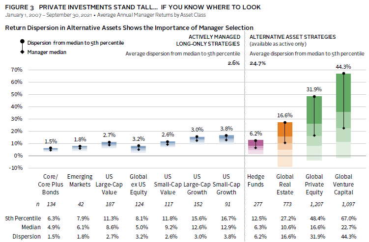 Notes: Returns for bond, equity, and hedge fund managers are average annual compound returns (AACRs) for the 15 years ended September 30, 2021, and only managers with performance available for the entire period are included. Returns for private investment managers are horizon internal rates of return (IRRs) calculated since inception to September 30, 2021. Time-weighted returns (AACRs) and money-weighted returns (IRRs) are not directly comparable. Cambridge Associates LLC’s (CA) bond, equity, and hedge fund manager universe statistics are derived from CA’s proprietary Investment Manager Database. Managers that do not report in US dollars, exclude cash reserves from reported total returns, or have less than $50 million in product assets are excluded. Performance of bond and public equity managers is generally reported gross of investment management fees. Hedge fund managers generally report performance net of investment management fees and performance fees. CA derives its private benchmarks from the financial information contained in its proprietary database of private investment funds. The pooled returns represent the net end-to-end rates of return calculated on the aggregate of all cash flows and market values as reported to Cambridge Associates by the funds’ general partners in their quarterly and annual audited financial reports. These returns are net of management fees, expenses, and performance fees that take the form of a carried interest. Vintage years include 2007–2018.