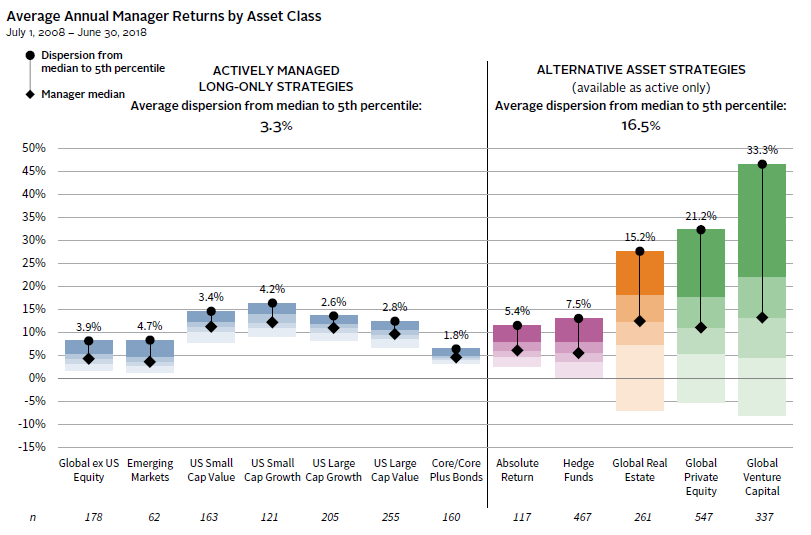 FIGURE 7 RETURN DISPERSION IN ALTERNATIVE ASSETS SHOWS THE IMPORTANCE OF MANAGER SELECTION