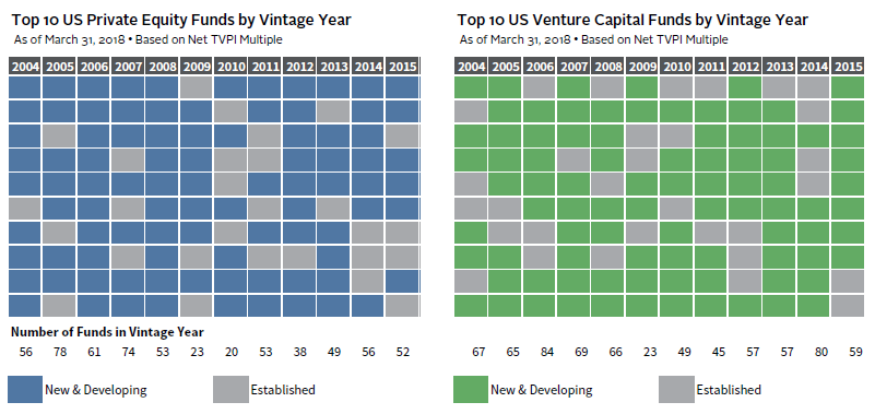 We’d all like to go back in time and place that bet on the winning horse! Likewise, with investments, it is easier to think about how an early investment in a particular fund or company would have benefited a portfolio than it is to gain comfort in a new opportunity. With private investments, many families assume there is less risk in the “famous” funds and lament the inability to gain access. However, new and developing funds actually are perennial top performers, as shown in Figure 8. Newer funds are usually led by experienced partners from established firms who have decided to break out on their own and are looking to raise much smaller amounts for their initial launch. The smaller size of these funds allows their managers to remain nimble and focused on attractive investments in their core area of expertise. The smaller size also often makes these investments more accessible to lower commitment levels and newer LPs. For investment opportunities with higher commitment levels, families could consider pooling assets to gain access.