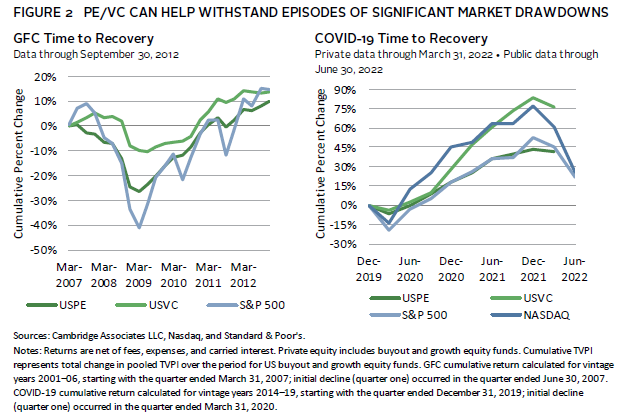 What’s more, PE/VC strategies have the capacity to help pension portfolios better withstand episodes of market volatility. Based on data from historical major equity market drawdowns over the past 25 years, buyouts and VC have experienced less severe drawdowns compared to public market equivalents (Figure 2). This lower volatility and valuation smoothing effect can be valuable for a plan that is sensitive to funded status volatility and whose sponsors wish to maintain or improve funding status.