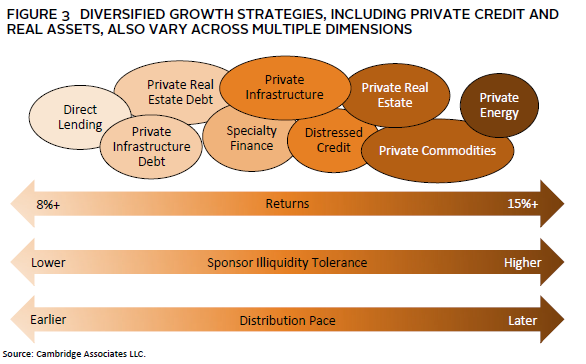 Private Real Assets. Private real assets strategies can be similar to private credit in that they can provide both income as well as capital appreciation, depending on the strategy. As a result, we would also categorize private real assets under diversified growth (Figure 3). However, the underlying assets include tangible real assets, such as property (i.e., office buildings, logistics centers), infrastructure projects (i.e., airports, toll roads, power plants), and commodities (i.e., oil & gas fields, mining investments, timber, agriculture). Given the variation of the types of underlying assets, return and risks differ greatly. Similarly, the terms and structures of real assets funds vary by strategy. Plan sponsors should note that commodities, such as energy sources, can have more direct beta to inflation. However, they can also be more volatile, driven by the underlying commodity price movements. Thus, these allocations are differentiated in their potential to deliver portfolio growth and diversification benefits during high inflationary periods. These characteristics can be particularly meaningful for plans with a large active population.