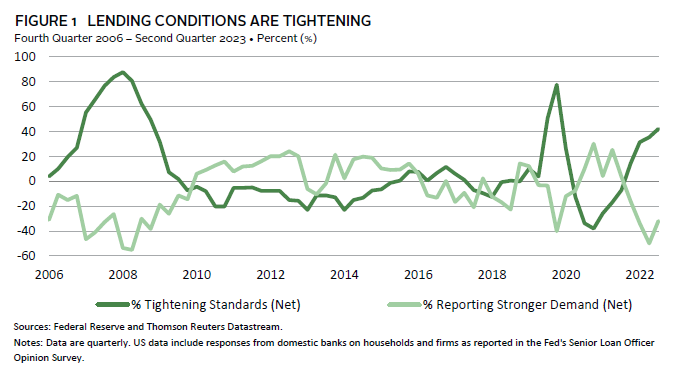 Putting aside the depth of any economic slowdown, weaker borrowers are also the most likely to suffer from the ongoing pullback in bank lending (Figure 1). Even before the recent US bank failures, surveys of loan officers were suggesting banks were battening down the hatches given rising recession calls, and higher bank funding costs (as well as calls for higher capital requirements) are likely to push up the cost of bank financing.