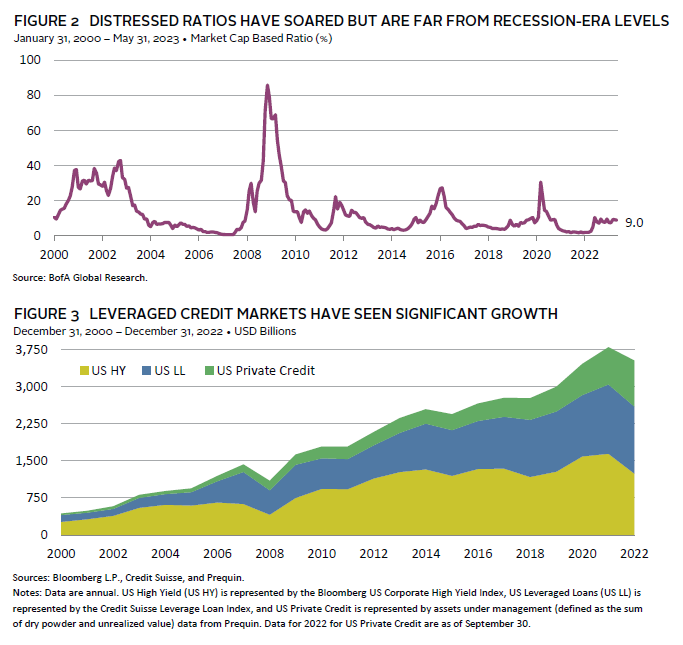 This macro and market environment have created opportunities for managers with flexible and creative capital in both the secondary and primary markets. In the secondary market, high-yield and leveraged loan distressed ratios 1 have increased meaningfully (Figure 2). For example, around 9% of high-yield bonds trade at distressed prices, more than 4x their level from early 2022. Given explosive growth in the leveraged finance markets over the last decade (to a combined market cap of around $2.5 trillion in the United States), this already represents a large opportunity set of almost $250 billion face value and could increase further if a recession ensues (Figure 3). Not all these securities will generate attractive returns, but significant relative value opportunities exist, and pricing can mask meaningful dispersion across underlying fundamentals. This is exacerbated by the lack of financial covenants and restrictions in BSL documents in recent years, allowing some borrowers to move assets and place them out of reach of existing creditors. Credit opportunity managers are positioned to find the best businesses in need of a financial solution and to take advantage of the weaknesses in public market legal documents.