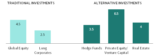 If our projection for muted investment returns proves to be accurate, plan sponsors will be challenged to generate returns in line with their assumptions. One response may be to increase the level of risk via traditional investments to generate higher returns. However, this can have severe reverberations across the organization during an asset drawdown. We believe many sponsors should instead consider changing the type of risk they incur by adding exposure to alternative investments.