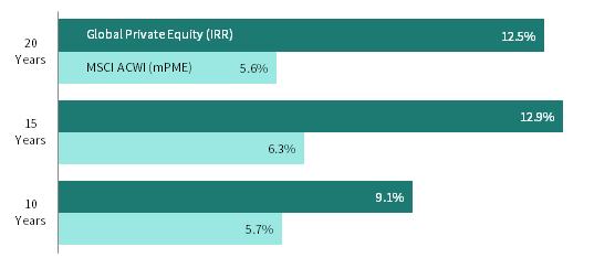 Notes: The global private equity index is a pooled horizon internal rate of return (IRR), net of fees, expenses, and carried interest. Cambridge Associates modified public market equivalent (mPME) methodology replicates private investment performance under public market conditions and allows for an appropriate comparison of private and public market returns. The mPME analysis evaluates what return would have been earned had the dollars invested in private investments been invested in the public market index instead. Total return data for the MSCI ACWI are gross of dividend taxes through fourth quarter 2000 and net of dividend taxes thereafter.