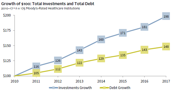 Healthcare systems deliver essential services and research to improve the quality of life in their communities. As they manage interactions with their patients, employees, physicians, payers, and donors, healthcare systems also rely on multiple capital pools that directly impact their financial health and growth. In aggregate, they have indeed become stronger financially in recent years. Since 2010, investment asset growth has increasingly outpaced additions to debt, fortifying healthcare system balance sheets (Figure 1). The deceleration of new borrowing and favorable interest rates have also benefited healthcare systems by controlling interest expense.