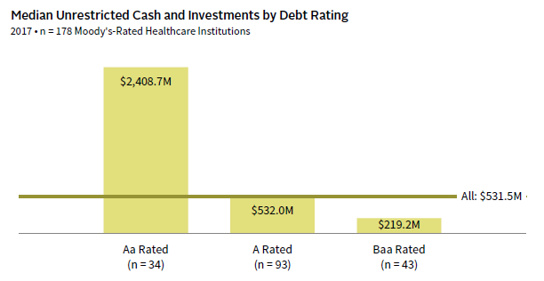 This asset accumulation dynamic creates a positive feedback loop: the more capital a healthcare system amasses—and therefore the lower its need to issue debt—the stronger its debt rating becomes. The size, liquidity, and flexibility of assets are important factors in supporting a healthcare system’s debt rating, which in turn influences the cost of debt and the capacity of an organization to deploy debt as a lever for strategic or operational reasons. The 34 Aa-rated healthcare entities in Moody’s 2017 universe, for instance, had nearly five times the unrestricted cash and investments of the overall median (Figure 2). Healthcare systems that have optimized their investments have accumulated billions more in their war chests with which to support—or expand—their missions.