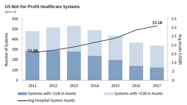 To counter some of these pressures, many healthcare systems have tried to achieve scale and generate greater cash flow through mergers or acquisitions (Figure 3). Larger systems can consolidate administrative functions and better negotiate reimbursement rates with insurers, as well as labor and supply costs. Larger entities tend to have more patient options and diversified revenue streams but, of course, consolidation also brings risk, particularly around integration of services and technology.