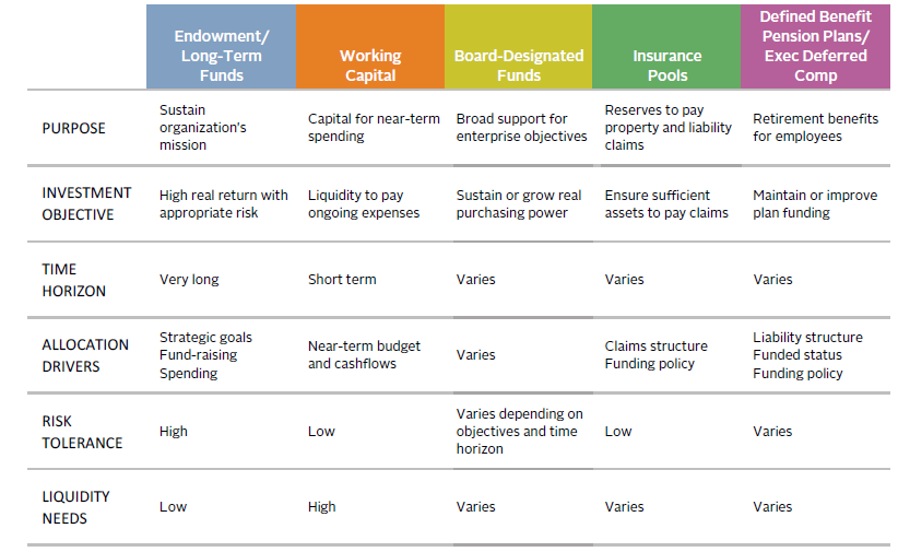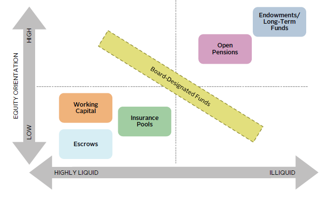 Work must also be done at the individual pool level to define the role each pool plays in supporting the enterprise. Such pools vary broadly by purpose (e.g., long-term restricted fund; escrows; short-term liquidity pool; pension), liquidity, time horizon, and other aspects. Although they may go by different names at different healthcare systems, they generally fall into one of several categories captured in Figure 4.