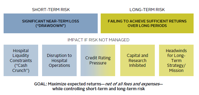As a foil to short-term risk, equal attention must be paid to the concept of long-term risk, which expresses the risk of failing to achieve sufficient returns over longer periods of time in inflation-adjusted terms. Such long-term risk results from an overly conservative investment strategy that may mitigate short-term risk by minimizing volatility but lead to a cumulative shortfall over time. These competing short-term and long-term risks can both be addressed by examining the healthcare system enterprise from the bottom up, at the most granular account level, as well as from the top down in a strategic sense.