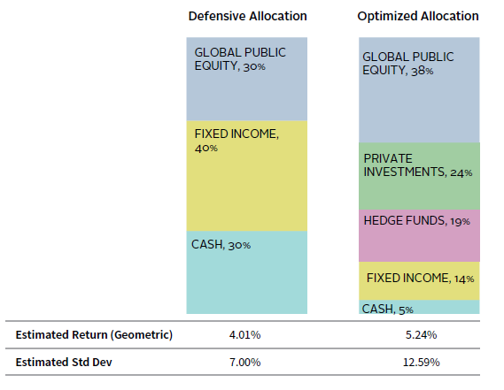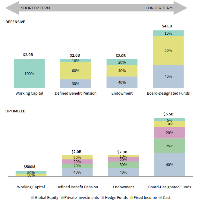 An optimal asset structure for healthcare systems not only addresses the allocation across asset classes but also the sizing of pools so as to ensure alignment with risk/return objectives. Figure 7 demonstrates this effect by comparing a more defensive healthcare system against an “optimized” healthcare system with regard to investment allocation and pool sizing. Although both institutions have identical assets for investment, the defensive institution maintains a higher allocation in shorter-term pools (i.e., working capital), while the optimized healthcare system has directed as much money as possible to longer-term pools (i.e., board-designated funds). In addition, the defensive healthcare system maintains more conservative asset allocations within each pool with heavier allocations to bonds and more liquid asset classes. Conversely, the optimized healthcare system has invested higher allocations in equity-oriented and less liquid asset classes.
