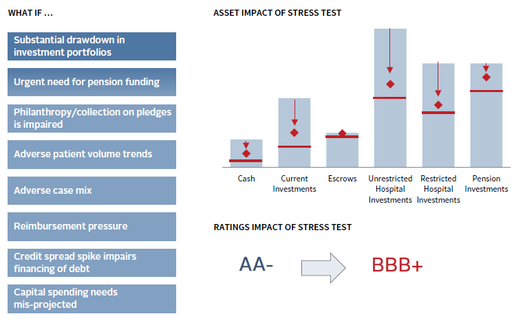 One of the most valuable exercises in healthcare investment management is conducting a thorough stress test to simulate a severe market event. The most robust stress test should be conducted as a partnership between investment and finance teams—making severe, but possible, assumptions of operational and investment adversity throughout the organization and investment pools. For the healthcare institution’s operations, economic adversity may mean modeling stresses such as severe declines in volumes or revenue, worsening of revenue mix, unexpected cost spikes, sudden regulatory uncertainty, impairment of cash flow conversion (i.e., will collections of receivables be impacted?), and balance sheet pressures that may damage the credit rating. For the healthcare institution’s investment pools, adversity can be quantified by stress testing each pool for a seizing up of capital markets including liquidity implications. The blended operational and investment stress-test results in calculating a theoretical “low water mark.” This worst-case base level should still be sufficiently high for all healthcare constituencies to take comfort that the enterprise is not assuming too much investment risk and can remain resilient (Figure 9).