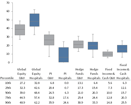 Healthcare systems differ significantly from endowments and foundations in how their investment pools are—and should be—invested. This is demonstrated in the figure below, which shows the range of asset allocation targets for healthcare systems and colleges and universities (C&U) with greater than $1 billion. On average, healthcare systems invest far more in public equities than does the C&U universe, primarily because they have less, on average, in private investments. Healthcare systems are also more likely to have much higher allocations to bonds and cash. Interestingly, there is greater disparity in asset allocations among healthcare system investment pools than C&Us, reflecting the fact that different healthcare systems have very different objectives, constraints, and operating considerations.