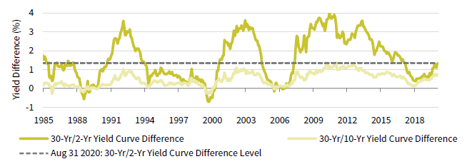 Yield curve steepness can be measured as the difference between the 30-year and ten-year yields or the 30-year and two-year yields (Figure 1).