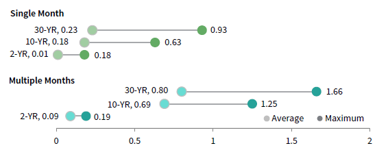 Figure 2 was derived from historical Bloomberg data for the two-, ten-, and 30-year Treasury rates. Data was adjusted to only include monthly periods where i) the absolute change in the two-year rate was less than 25 bps and the 30-year rate moved more than two times the absolute change in the two-year rate, ii) the absolute change in the two-year rate was less than 25 bps, but the 30-year rate rose at least 10 bps and at least twice as much as any rise in the two-year rate. Multiple month analysis included periods of general steepening and included at most two months where the rates might not have followed the rules stated above as long the two-year rate still moved less than 25 bps and the curve did not experience a flattening event during those months.