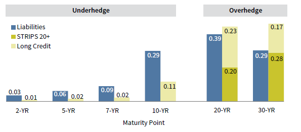 For example, consider a somewhat-mature, well-funded plan, invested with 65% of assets in a combination of long STRIPS and long credit and 35% in growth assets. In this case, while the overall interest rate hedge ratio is 90%, the interest rate hedge at different maturities is not an even 90%: there is a definitive overhedge at the long end (Figure 3). In other words, assets are expected to hedge 90% of a parallel yield curve shift, but the impact of moves in 20- and 30-year yields is bigger on assets than it is on liabilities (and the impact of moves in two- through ten-year yields is smaller).