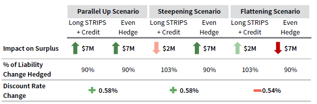 In a parallel yield curve shift scenario (ignoring any other market moves), a combination of STRIPS and long credit behaves just like an even 90% hedge across the curve, hedging 90% of the dollar change in the liabilities. However, in the average yield curve steepening scenario noted in the previous section, while an even hedge still hedges 90% of the dollar changes in the liabilities, this strategy leads to the counterintuitive result that assets fall more than liabilities. This means that the deficit actually increases despite interest rates being higher (Figure 4)! Of course, in a mirror-opposite yield-curve flattening scenario, the opposite is true and the deficit decreases even as interest rates fall.
