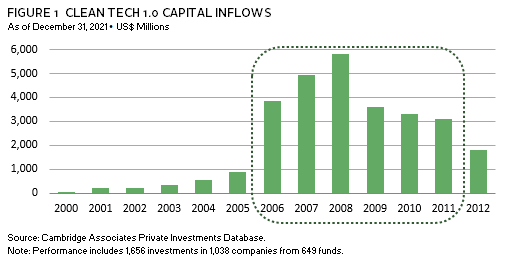 The first wave of climate technology investing (Clean Tech 1.0) began in the early 2000s as Silicon Valley venture capital (VC) firms marched into the sector with more enthusiasm than experience. These clean tech pioneers were propelled by a growing awareness of the urgency behind climate change, following public campaigns from prominent advocates including former US Vice President Al Gore and venture capitalist John Doerr. The demand for positive environmental impact coincided with compelling market opportunities driven by historically high energy prices and favorable government subsidies. Between 2006 and 2011, we estimate that investors poured approximately $25 billion into clean tech companies (Figure 1).