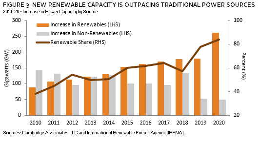 On top of this more robust network of investors, Climate Tech 2.0 appears to be benefiting from multiple macro factors. One of the most significant of these factors is the drastic decline in the cost of renewables and batteries, 2 which is enabling the energy transition at a speed and scale that was not achievable during Clean Tech 1.0. The cost decline in renewables has been so dramatic that solar and wind are frequently cheaper than fossil fuels in many locations. This has resulted in new capacity in renewable energy outpacing traditional power sources (Figure 3), a trend that is likely to continue to accelerate. Tangential technology cost declines across a variety of areas—such as sensors, hardware inputs, general business start-up costs—and the adoption of information technology and software have all benefited Climate Tech 2.0, as it has for other start-up sectors of the economy. All of these technology cost declines have significantly improved the unit economics of many Climate Tech 2.0 business models and have helped climate tech start-ups compete with the traditional industries they are attempting to disrupt.