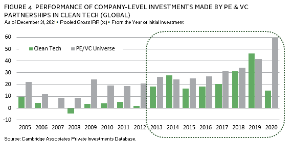 Performance reflects gross deal level returns from 2006 to 2011. These investments comprise all company-level investments made by private equity and venture capital partnerships assessed as eligible for the CA Climate Solutions Company Performance Statistics during these vintage years. Comparative PE & VC benchmark includes Global CA VC & PE benchmarks. As of December 31, 2021, Cambridge Associates (CA) screened over 111,000 investments held by over 8,900 funds to identify clean tech investments. CA includes companies and projects in the clean tech sector if they (1) develop non-fossil fuel energy sources, (2) promote industrial efficiency by conserving resources and replacing existing processes with less-polluting alternatives, (3) recycle waste efficiently, or (4) provide a product or service that creates an environmental improvement.