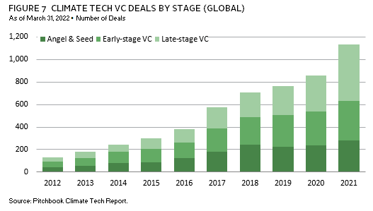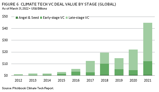 Today, capital flows into climate tech investing are growing again at record levels, from seed stage to growth equity. Across the venture landscape, climate tech attracted almost $45 billion in inflows in 2021, more than doubling that in 2020 (Figure 6). According to a recent PricewaterhouseCoopers (PwC) report, climate tech accounted for more than a quarter of every venture dollar in the 12 months prior to September 2022. 7