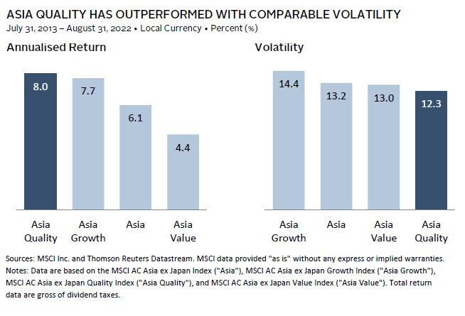 Historically, Asia quality has outperformed the broad market with comparable volatility. However, these companies generally tend to command a valuation premium, and the sharp rise in global interest rates has led to a repricing of quality stocks, causing performance to trail that of broader Asia and global equities year-to-date. As a result, valuations have declined from previously stretched levels and are now low in both absolute and relative terms. Thus, we believe client portfolios should benefit from the addition of quality characteristics, given reasonable valuations and the defensive profile of underlying names.