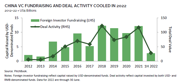 Overall, while near-term sentiments toward China are mixed, the market still holds potential in the longer term. Indeed, consumer technology themes have plateaued, given market developments and regulatory headwinds. But China’s increased emphasis on self-sufficiency and innovation in the clean energy and “deep technology” sectors (e.g., semiconductors, automation), supported by the already well-developed supply chain and advanced manufacturing capabilities, presents a secular growth opportunity for companies in these areas. Meanwhile, investors are also focused on the potential lifting of China’s zero-COVID policy. Any clarity on the lifting of zero-COVID could trigger a rebound in China’s growth prospects and financial markets and lead to a renewed surge in China VC deal activity and fundraising.