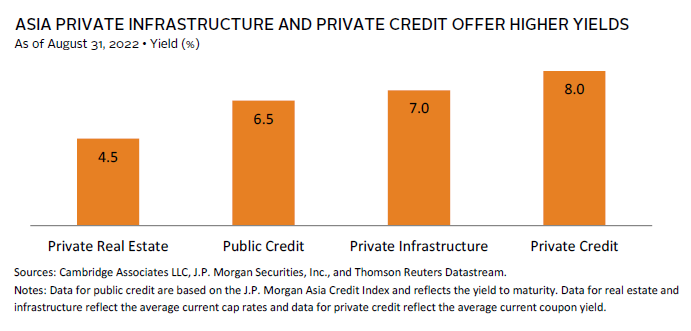 For investors with a higher risk tolerance, there are also opportunities in Asia private credit where recent market volatility has led to increased credit market dislocations. As liquidity tightens from traditional lenders, private credit funds have an opportunity to fill in the gap. Such strategies often use bespoke and more complex capital solutions, allowing for funds to target a yield of 8% or higher, and are often focused on small and medium enterprises that in aggregate provide a diversified pool of underlying asset collateral in multiple sectors and creditor-friendly jurisdictions. The nature of the target borrowers implies that such strategies tend to be biased toward developed Asia (e.g., South Korea, Hong Kong, and Australia), offering a differentiated exposure to emerging growth-oriented Asia private investments.