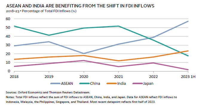 Like India, ASEAN is another market facing tailwinds from positive demographic changes and the global shift in supply-chain diversification from China. Currently, the region seems to be a key beneficiary of US-China tensions, gaining export share in the United States at the expense of China, but simultaneously seeing a rise in Chinese imports and investments. FDI inflows to the region increased by more than 50% in 2021–22 from 2019–20 levels. While Singapore continues to see the bulk of inflows, countries such as Vietnam have seen a rise in manufacturing investments, including some capital from Chinese companies looking to reduce labor costs and diversify their own manufacturing base. Meanwhile, FDI inflows to Indonesia also remain high, driven by mining industry investments.