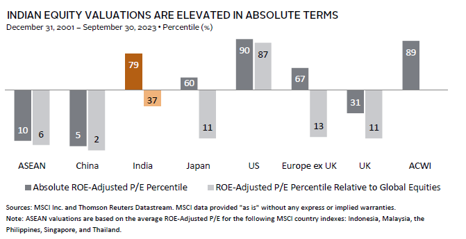 Given recent performance, valuations for Indian equities remain expensive relative to their own history and broader EM equities, although they still trade below their historical average relative to DM equities. Earnings growth expectations are also very high, which, taken together with elevated valuations, increases the downside risks of disappointment. And while the RBI has been on an extended pause since February 2023, upside risks to inflation arising from volatile food prices and higher oil prices could drive the central bank to further tighten policy, which could weigh on the equity market.