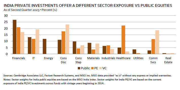 Indian private investments, particularly Indian VC, are more attractive in capturing the longer-term opportunities arising from shifting demographics, increased digitalization of the market, and the growth in demand for consumer services (e.g., e-commerce), business services (e.g., software applications), and financial services (e.g., financial mobile apps). Trailing ten-year returns for Indian VC have been comparable to US VC in USD terms, albeit lagging Chinese VC. However, return prospects have improved with the strengthening of manager expertise, an increase in exit channels (e.g., local capital markets, NASDAQ, financial sponsors, and strategics), and a buildup in the track record of exits. Valuations have also corrected from their 2022 highs, which, taken together with the strong macro fundamentals, create an attractive entry point for a ten-year VC investment strategy. Indian private equity (PE) offers less appeal as the manager opportunity set is less deep compared to Indian VC. In addition, the difference in sector exposures (e.g., PE focuses on brick-and-mortar retail, finance companies, and hospitals) results in lower target returns, which, after accounting for INR depreciation, makes the market less attractive relative to Indian VC.