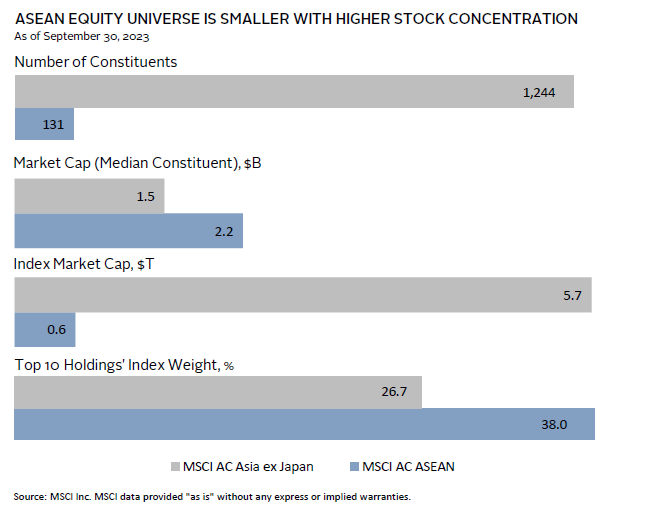 A challenge when investing in ASEAN equities is the smaller investable universe and the market’s higher stock concentration. This could gradually improve over time with capital inflows and as the markets deepen. But for now, the narrower opportunity set is also reflected in the limited number of dedicated ASEAN implementation options—both passive and active—that are available, making it difficult to meaningfully overweight this market directly via ASEAN mandates. Further, Vietnam, which has grown as a share of ASEAN’s GDP (11%) and exports (19%) over the past decade, is classified as a frontier market and not a part of the MSCI ACWI or MSCI ASEAN Index. At $30 billion, the MSCI Vietnam Index would only account for 5% of the MSCI AC ASEAN Index and 0.5% of the MSCI AC Asia ex Japan Index market cap if included.