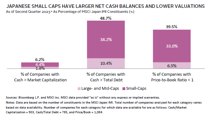 Valuations also may not offer a sufficient cushion against downside risks. Given the recent rally, the MSCI Japan Index is fair-to-expensive across the valuation metrics we track, although it still trades at a discount to global equities for which valuations are even higher. However, there is a long tail of smaller and somewhat illiquid companies in Japan that still trade at below–book value valuations and some with cash balances larger than their debt or even market cap that are often cited as evidence of Japanese equities being “cheap.”