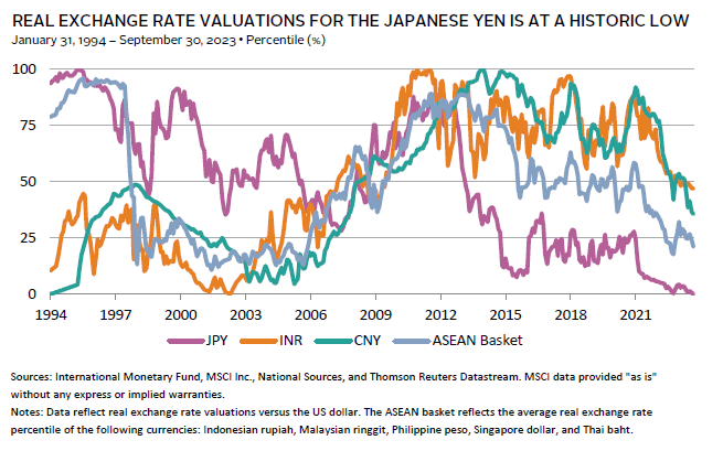 Despite the positive macro backdrop, valuations for ASEAN equities (as proxied by the MSCI AC ASEAN Index) remain low, which is in part due to the current composition of the domestic equity market. ASEAN equities are meaningfully underweight tech, for which valuations have generally run up amid the previous low interest rate environment, and are overweight cyclical sectors, with close to 60% of the index made up of banks, industrials, and real estate companies. ASEAN’s sector composition resulted in strong earnings growth and outperformance relative to other Asian markets in 2022. However, relative earnings growth expectations have rolled over and relative performance reversed YTD, reflecting concerns over the export-oriented and cyclical nature of the market amid slowing global growth and trade. Yet, lower starting equity valuations provide a cushion, and ASEAN equities have more upside potential when the global economic cycle turns back up. Furthermore, ASEAN currencies also appear undervalued in real terms, and currency appreciation could help boost returns for investors, particularly if the Fed and other major global central banks begin to ease.