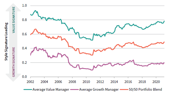 We can also put the two lines together to approximate where an average portfolio with equal allocations to active growth and value managers would have been at any point in time relative to its exposure to growth and value stocks. For example, an equally weighted portfolio with the average growth and value manager at the end of 2010 would have had a style signature tilted to growth by a factor of around 69% to 31%. 2 That likely would have resulted in an attractive outcome over the following decade given growth stocks’ outperformance over value stocks, if styles didn’t change over time! But for an investor that believed they had balanced allocations to growth and value managers, it would have been a lucky accident, which could have gone the other way under different circumstances.