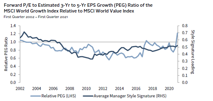 The term style drift typically has a negative connotation for investors because it implies that a manager is straying from its strategy or objective, but it appears to be quite normal. To be clear, we do not believe that most managers intentionally set out to buy more growth stocks or more value stocks; rather, in our experience, the movement in Figure 1 reflects changes in the opportunity set rather than an intentional style tilting strategy. The data show that growth and value managers tend to stay on their side of the style divide, and the style signature of both groups appears to drift together. The correlation between the two lines in Figure 1 is 86%, implying that there is some commonality in what growth and value managers look for that results in a natural co-movement. Since expected earnings growth and valuation are common investment variables to both styles of managers, a ratio comparing growth stocks’ and value stocks’ price-to-earnings relative to long-term expected growth (PEG) can provide a useful lens for evaluating managers’ movement.