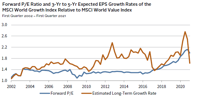 Focusing on the component pieces of the PEG ratio of the MSCI World Growth Index relative to the PEG ratio of the MSCI World Value Index, we can see what drove the increasing appeal of growth stocks. As shown in Figure 3, a gap opened between the comparative trend in earnings growth expectations and valuation around 2003 that remained for quite some time. Growth expectations for growth stocks went up relative to value stocks, but the comparative valuation stayed the same, making growth stocks more appealing per unit of value for everyone. By 2017, the gap closed and the value signature for value managers had increased back toward the historical average. Yes, value managers can find appeal in growth stocks when the prices seem right, and growth managers can also sometimes find appeal in value stocks. They are all assessing relative growth and relative value in their own tactical way.