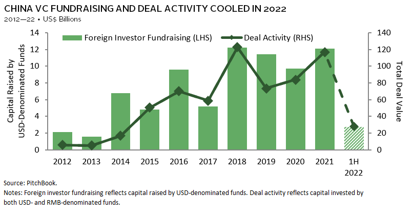 In China, the story is mixed. Consumer technology themes have plateaued, given market developments and regulatory headwinds. But China’s increased emphasis on self-sufficiency and innovation in the clean energy and “deep technology” sectors (e.g., semiconductors, automation), supported by the already well-developed supply chain and advanced manufacturing capabilities, presents a secular growth opportunity for companies in these areas. A core challenge is whether the US or Chinese government will place restrictions on investing in these sectors. Meanwhile, any clarity on the lifting of China’s zero-COVID policy could trigger a rebound in China’s growth prospects and its financial markets, leading to a renewed surge in China VC deal activity and fundraising.