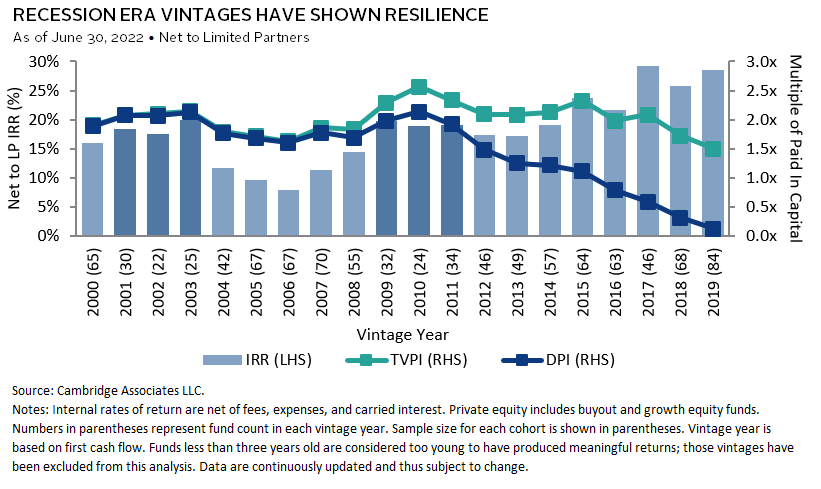 We expect the cyclical backdrop to impact private equity and venture capital returns, ultimately influencing recently invested vintages the most. That said, we think the 2023 vintage could perform well.