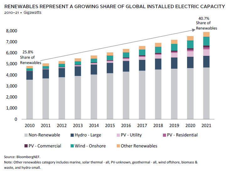 As economics have improved, corporate and consumer demand for lower-carbon products and services has increased, accelerating the transition in a virtuous cycle. Lazard estimates that before subsidies, the levelized costs of energy for utility-scale solar and onshore wind have decreased 83% and 63%, respectively, since 2009. As a result, renewables are taking market share over fossil fuels, as demand is broadening to include corporations—such as Amazon—that are increasingly purchasing clean power. With nearly 50% of new annual global electricity capacity coming from renewables, installed capacity is now roughly 40% renewable, driven by growth in utility-scale solar and onshore wind over the last decade.