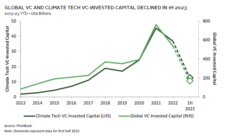 Climate tech PE/VC is facing similar headwinds as the broad market in terms of slowing deal activity and exits, given the higher rates environment. Globally, first half 2023 VC climate tech–invested capital and deal count fell 31% and 38%, respectively, from first half 2022 levels, albeit less than the declines seen in broad VC over the same period (50% and 40%, respectively). Public market exits for climate tech companies in 2022 also fell alongside their peers, with the decline more marked for exits via special purpose acquisition companies (SPACs), which had been a preferred option for high revenue growth but negative earning tech companies. Another metric to monitor is valuations, which have diverged from their peers over the past two years. Valuation-to-revenue multiples for climate tech PE/VC deals stood at 9x and 22x, respectively, in 2022, versus 3x and 15x, respectively, for their broad market equivalents.