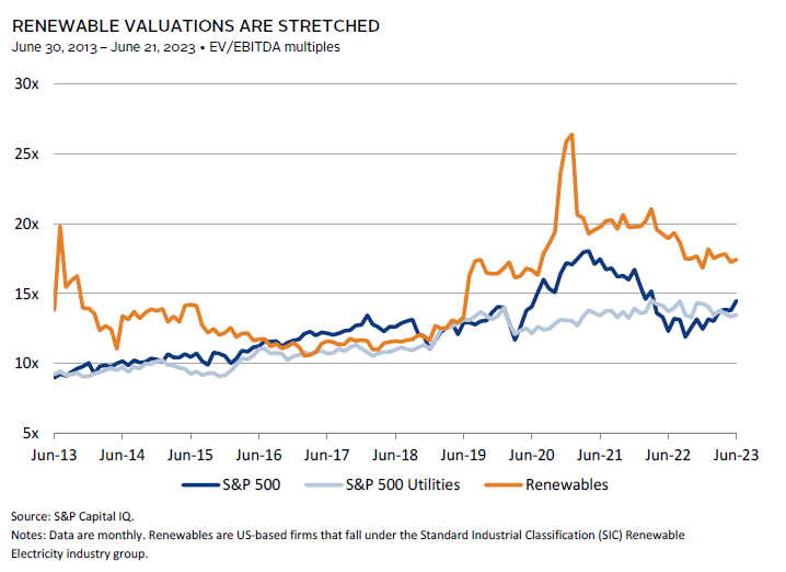 Like PE, performance in public equities addressing the energy transition has been volatile, with some indexes dramatically underperforming the broad market for a decade through 2020 before experiencing a year or two (depending on the index used) of explosive relative and absolute performance. Valuations for renewables remain elevated relative to utilities and the broad market, while more tech-oriented indexes (e.g., the Wilderhill Clean Energy Index) have negative aggregate earnings reflecting the risk of owning such securities, especially if the cost of capital remains elevated.