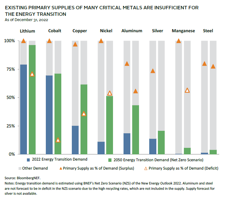 The energy transition will be accompanied by a structural increase in demand for certain critical metals, considering the intensity of their usage in renewable energy infrastructure and in the electrification of transport. Copper will see the highest growth in absolute volume, given its application across the value chain, from wind turbines and electricity grids to EVs, but lithium will see one of the sharpest rises in demand relative to current levels due to the dominance of lithium-ion batteries. Without new discoveries, BloombergNEF forecasts that the supply of many of these metals would fall short of the projected increase in demand, thereby increasing input costs to clean infrastructure and constraining newbuild projects.