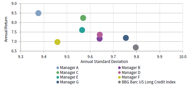 Most active fixed income managers look to avoid uncompensated tracking error relative to their benchmark, which is typically the Bloomberg Barclays US Long Credit Index. 5 Instead, managers aim for outperformance while keeping the volatility comparable to the benchmark.