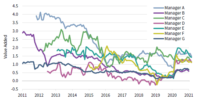 Figure 1 depicts a sample group of active fixed income managers, with varying degrees of outperformance between April 2016 and March 2021—some by considerable margins. The top manager outperformed by 180 bps annually over the five-year period, while some of the more conservative managers outperformed by 30 bps to 50 bps over the same period. In all cases, standard deviation of the performance was below the benchmark, indicating that volatility was well-managed and the managers did not produce additional risk in an asset allocation context.